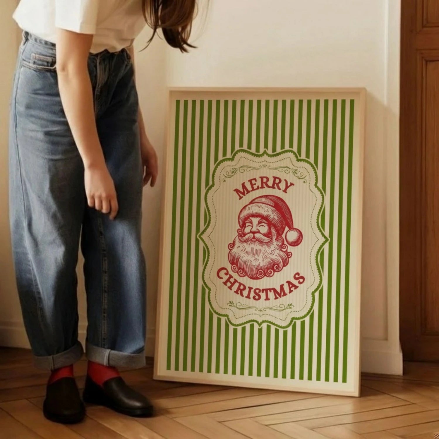 Embrace a graceful festive look with this Merry Christmas Vintage Green Retro Stripes Wall Art, blending holiday poster elegance with trendy santa art and wall decor charm for a refined seasonal touch.