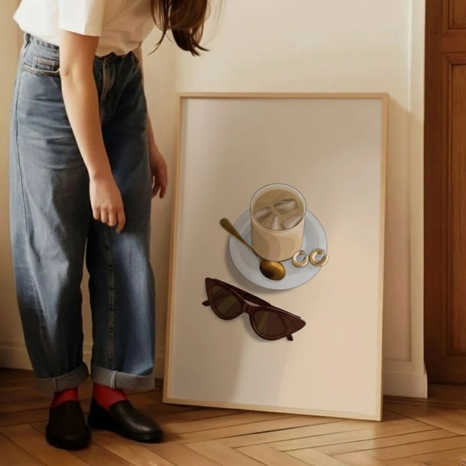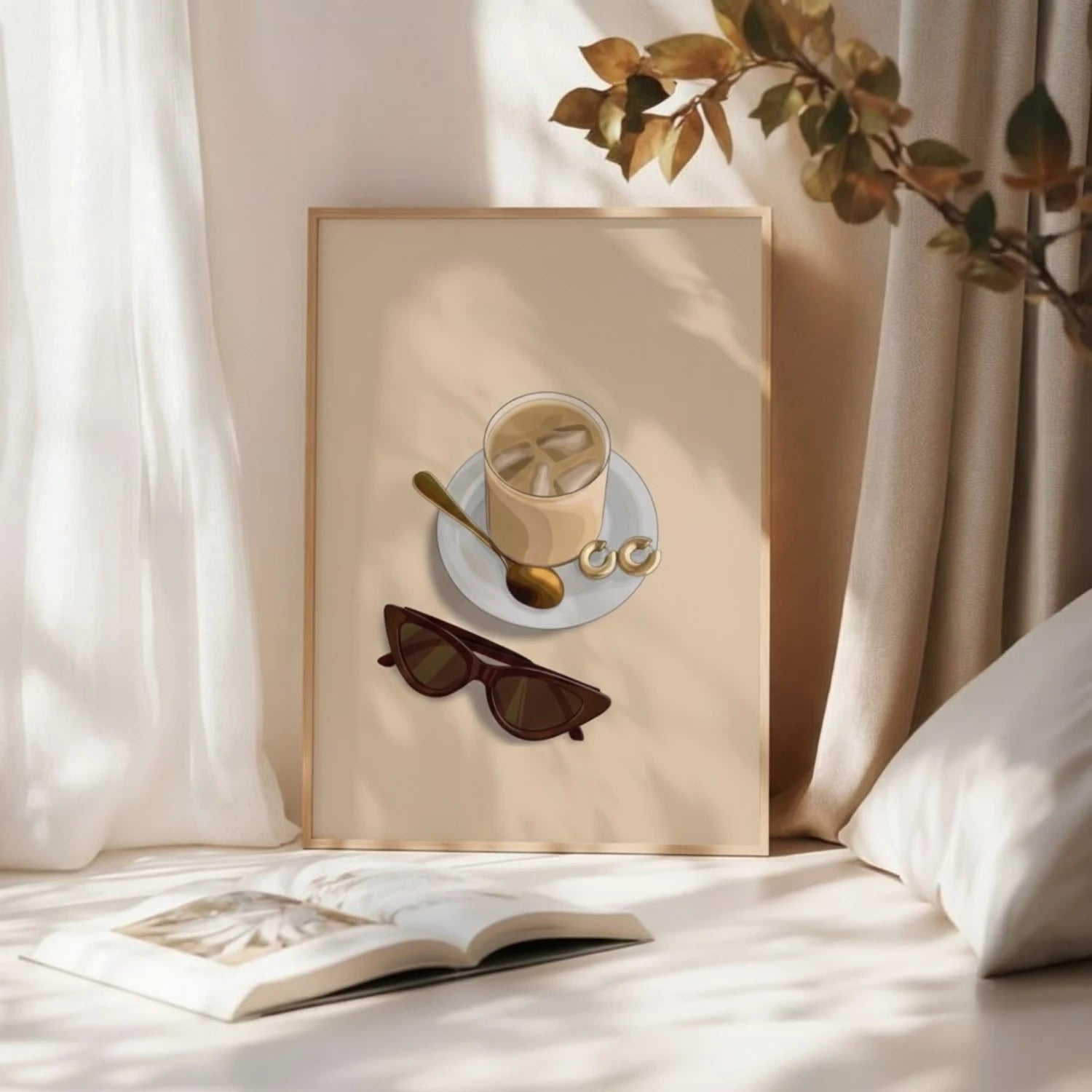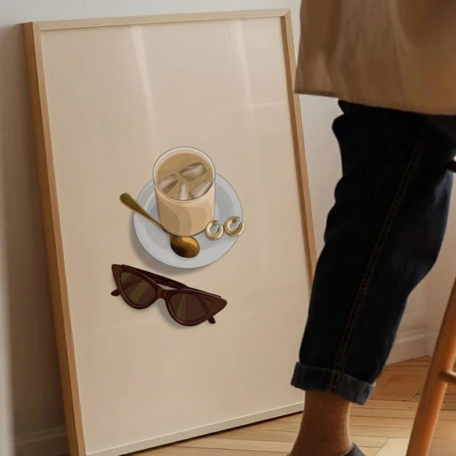 This Minimalist Iced Coffee Wall Art with Sunglasses brings soft elegance to any space, blending neutral coffee bar wall print and chic kitchen drink illustration accents for a refined, modern finish.